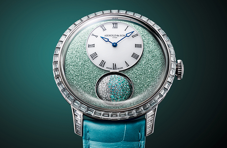 A traditional dial is located at 12 o’clock, marked with 12 signature Arnold & Son Roman numerals. This off-center subdial owes its pristine, slight milky white hue to opal. Its classic design harks back to the aesthetics of the famous marine chronometers made by English watchmaker John Arnold. Under the time display, Luna Magna’s three-dimensional moon takes on a new appearance. The white gold globe is entirely pavé-set. It is split into 161 brilliant-cut diamonds, representing the illuminated side of the moon, and the same number of Paraíba tourmalines for the portion in shadow.