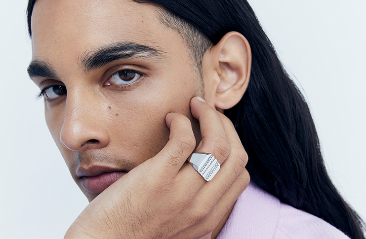 The De Beers’ monogram inspired the collection’s aesthetic, with outlines of the ‘D’ and ‘B’ imprinted in the metal to form lines that resemble a code and, when viewed from the side, a gear. Like the De Beers initials hidden within the design, one’s unique character is not immediately evident; it must be revealed. As a mechanism that incites action, De Beers RVL emboldens the wearer to express their extraordinary self to the rest of the world through various contemporary materials, distinct designs and playful styling.