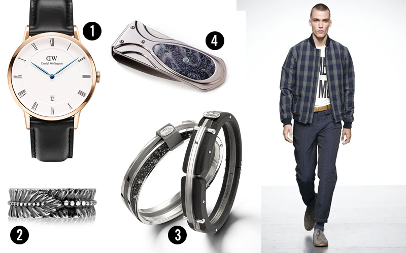 Blue is a great colour to work with, find it in the watch and money clip. Also, use hints of black in the jewellery to spruce up a casual everyday look will really make you stand out.