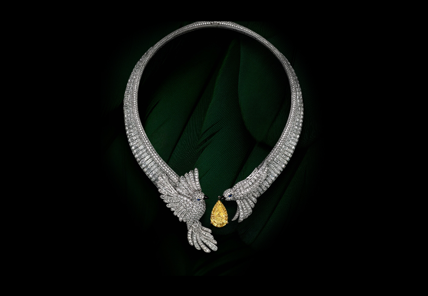 The necklace showcases two diamond sparrows, a symbol of love and togetherness, brought to life with sapphire eyes and onyx beaks. One bird perches gracefully, presenting a rare 13.51-carat Fancy Intense Yellow pear-shaped diamond, while the other is captured mid-flight with wings adorned in diamonds. The piece’s architectural yet fluid design emulates the sweep of a feather, with baguette diamonds custom-cut to achieve remarkable flexibility and movement—a hallmark of Graff’s creations.