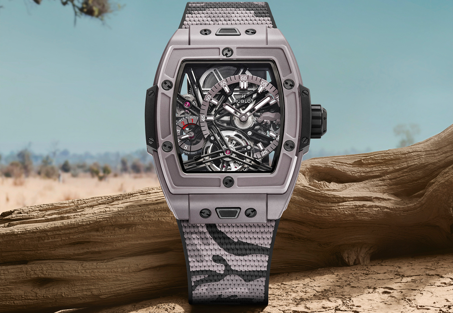 SORAI also supports anti-poaching programmes, which are critical in addressing the complex socio-economic factors driving poaching. The *Spirit of Big Bang SORAI* features a 42mm case crafted from micro-blasted and polished “warm grey” ceramic, echoing the texture and colour of rhino skin. The watch comes with two strap options: a grey fabric strap and a black rubber strap with a grey and beige camouflage pattern. Powered by the HUB6020 Manufacture calibre, the hand-wound, skeletonized tourbillon movement offers a five-day power reserve and features an asymmetrical display, with a time display at 3 o’clock and a power reserve indicator between 8 and 9 o’clock. With just 30 pieces available, the *Spirit of Big Bang SORAI* continues Hublot’s legacy of supporting meaningful causes through innovative design and craftsmanship.