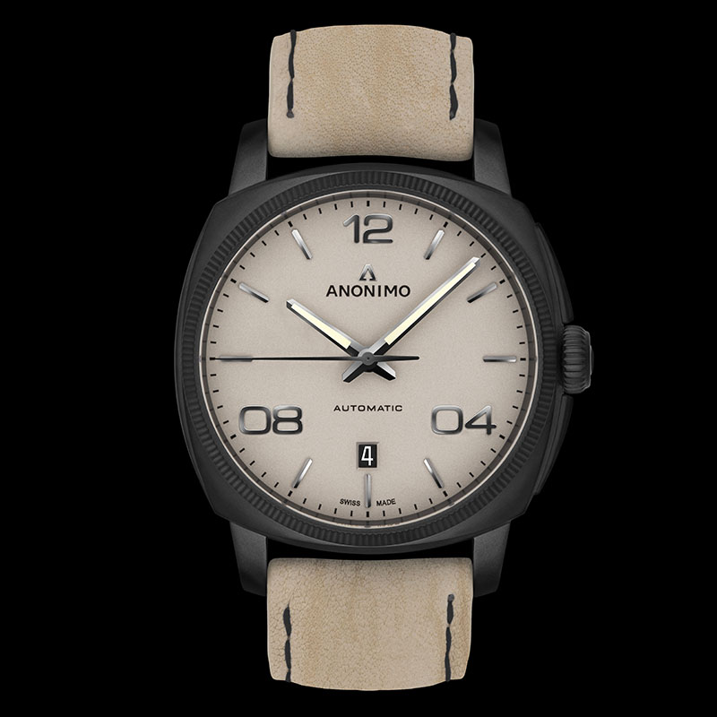 From the Epurato collection from Swiss watchmaker Anonimo, this watch in stainless steel and diamond-like carbon with a 42-mm diameter features a domed sapphire crystal with anti-glare coating. The sand-coloured dial is complemented by a Sand Kudu leather strap.