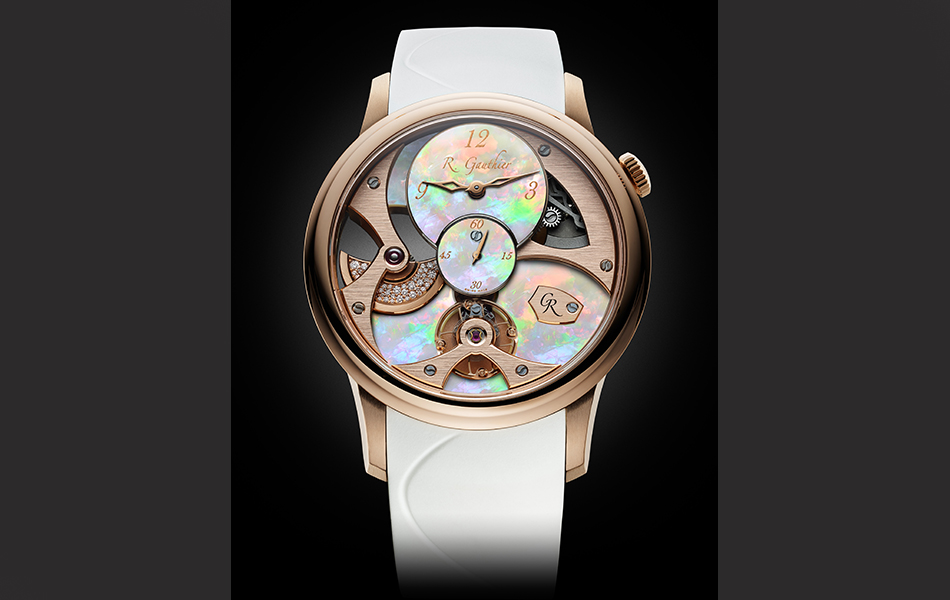 The glorious opal subdials and mainplate cover set off the red gold hands, gilded balance wheel and red gold treated plaquette and bridges that are hand-bevelled and straight-grained, while the arcs of the bridges neatly marry with the inside curve of the red gold case. The case’s 39.5mm diameter, combined with the white natural rubber strap that mirrors the contours of the lugs, provides a snug fit on slender wrists.