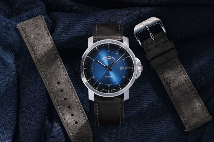 The coastal blue dial sets the tone with a clean, sunburst finish and gradient effect that darkens toward the edge—creating sharp contrast for excellent legibility. Paired with applied indices and Super-LumiNova-coated markers, the timepiece upholds Mühle’s commitment to clarity, no matter the environment.