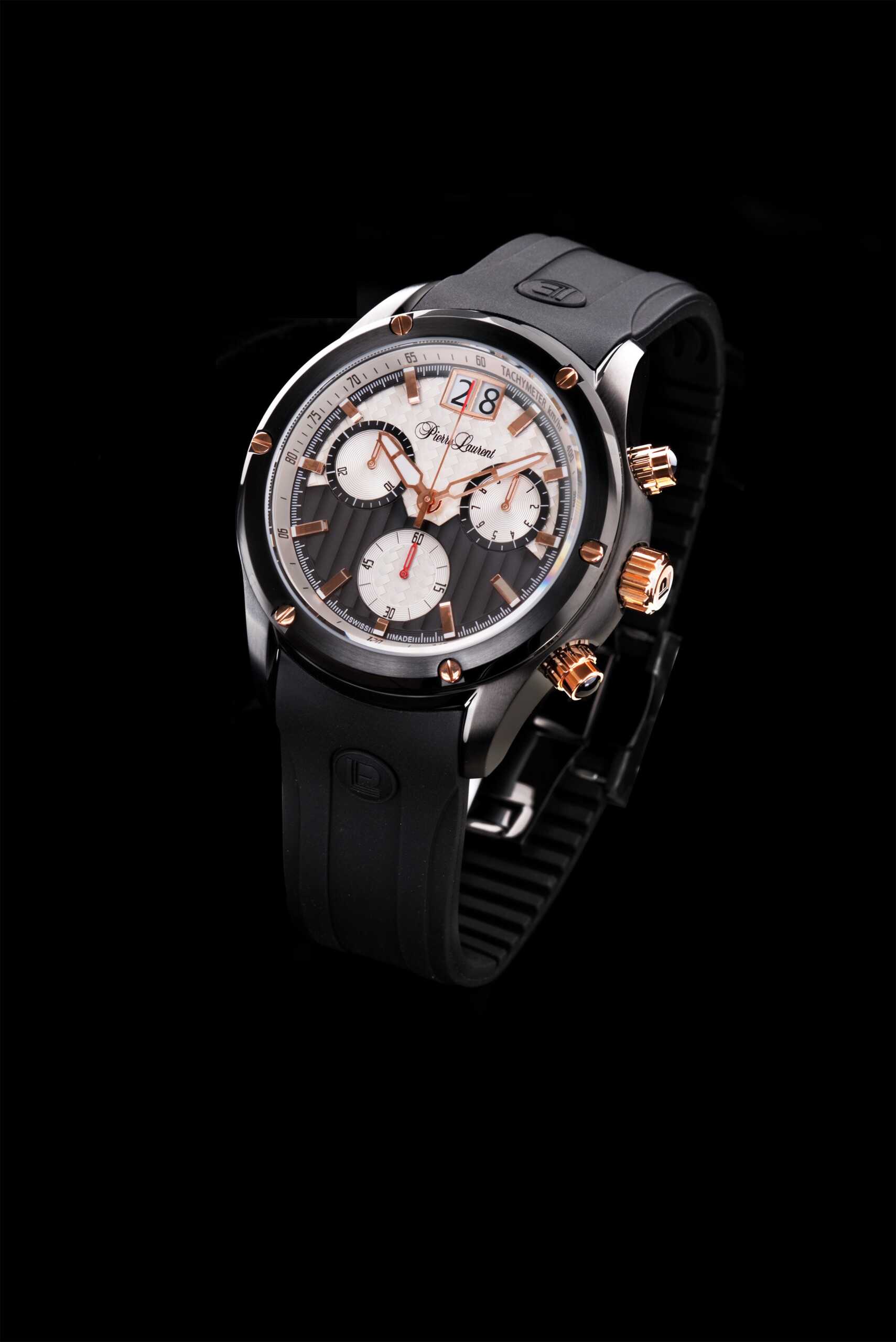 A touch of rose gold accentuated by a black PVD plated 316l stainless steel case and black natural rubber strap with a double deployment clasp. Swiss made chronograph movement, oversized calendar, sapphire crystal, screw back and crown WR 100m, are just some it’s features. An elegant Swiss made timepiece that is just as comfortable with a suit as it is in the gym.