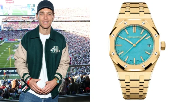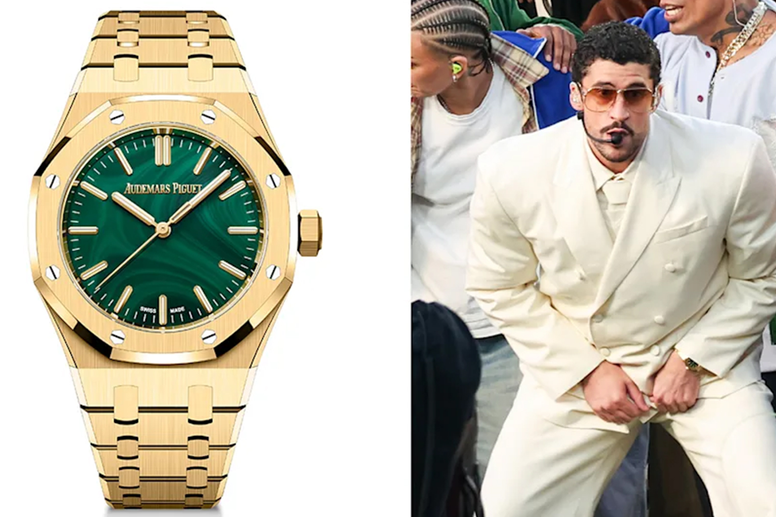 Bad Bunny’s halftime appearance triggered the night’s most shareable “what was that?” watch moment: a Royal Oak Selfwinding in yellow gold with a malachite dial. The stone dial matters as much as the logo here — malachite reads instantly on camera, it’s naturally patterned (so every dial feels one-of-one), and it signals “new” even to shoppers who already know the Royal Oak shape. (Hodinkee)