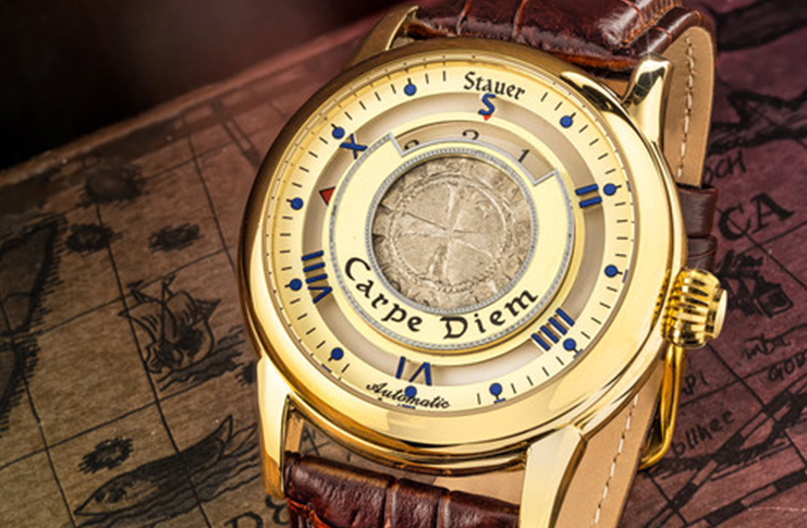 The Crusader Watch complements this historic coin with a brown leather strap and a 21-jewel movement to ensure accuracy and reduce internal friction. Additionally, this watch marks the hours in a narrow window that shows a rotating inner dial and includes the words “Carpe Diem.”